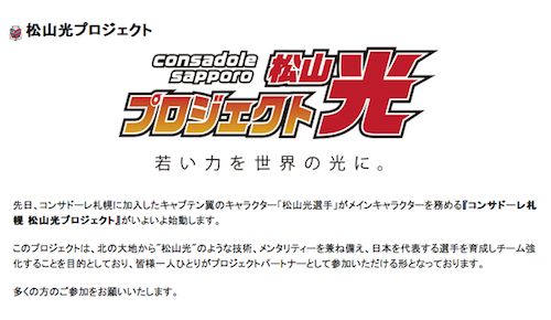 『松山光プロジェクト』は、2014年シーズンから始まったプロジェクト。今季で2季目。コンサドーレ札幌を金銭的に支援することを主目的とする。従来実施されていた個人向けのパーソナルスポンサー制度がリニューアルしたもので、それまでのものに比べて「育成・強化への支援」という目的を明確化している点が大きな特徴です。