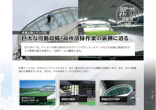 施設紹介の1回目となる記事では、ドームの巨大な可動設備・高所清掃作業の裏側を紹介。コンサドーレ札幌の試合が行われるホヴァリングサッカーステージの他に、開閉式可動席、展望台のガラス清掃などが紹介されている。