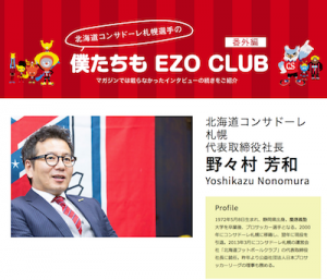 EZOCLUBマガジン2015年9月号に古田寛幸選手のインタビュー記事が掲載されて以降、2016年12月号に宮澤裕樹選手、2016年3月号に野々村芳和コンサドーレ社長の記事が掲載。その番外編として、オンラインにもインタビュー記事が掲載されているもの。