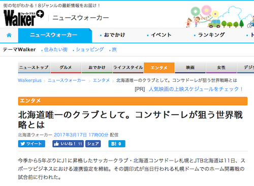 北海道ウォーカーのサイトで、北海道コンサドーレ札幌とJTB北海道の提携に関する記事が掲載されています。