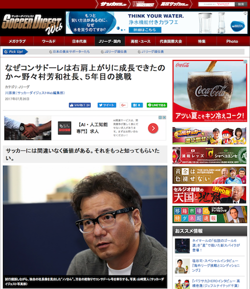サッカーダイジェストのサイトに野々村芳和社長のインタビュー記事が掲載されています。川原崇さんの記事。