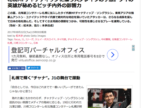 フットボールチャンネルにチャナティップ選手の記事が掲載されています。舩木渉さんの記事です。 記事は、J1第23節川崎フロンターレ戦後のチャナティップ選手の様子から始まります。チャナティップ選手の潜在能力を高く評価していま … 続きを読む フットボールチャンネルにチャナティップ選手の記事