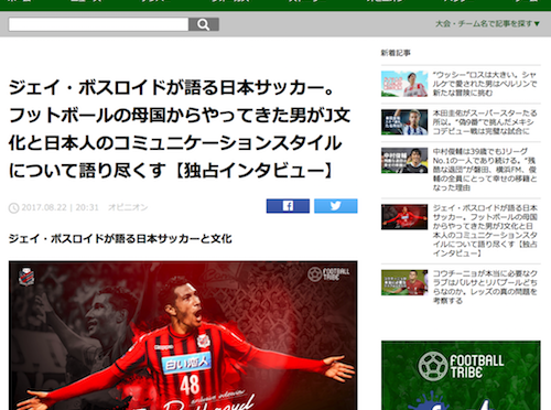 Football Tribeのサイトにジェイ選手のインタビュー記事が掲載されています。チェーザレポレンギさんによるインタビューです。 ジェイ・ボスロイドが語る日本サッカー。フットボールの母国からやってきた男がJ文化と日本 … 続きを読む Football Tribeのサイトにジェイ選手のインタビュー記事