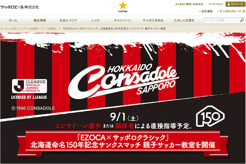 - 内容:EZOCA×サッポロクラシック コンサドーレ応援キャンペーンパック(サッポロクラシック6缶パック)の内面に印刷されたハガキで応募して、抽選でコンサドーレ選手または関係者が直接指導予定の親子サッカー教室に20組40名を招待。