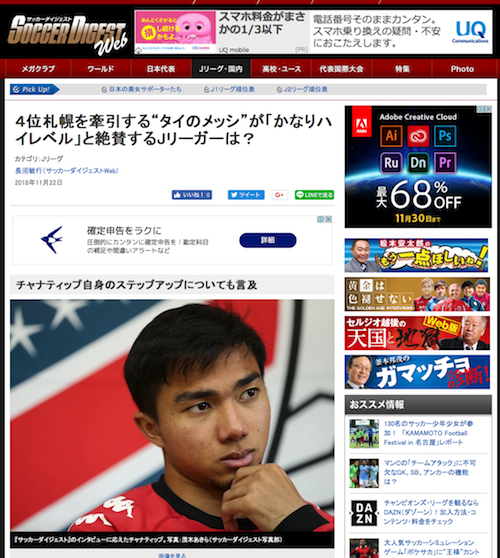 サッカーダイジェストのサイトに、北海道コンサドーレ札幌のチャナティップ選手のインタビュー記事が掲載されています。長沼敏行さんの記事。