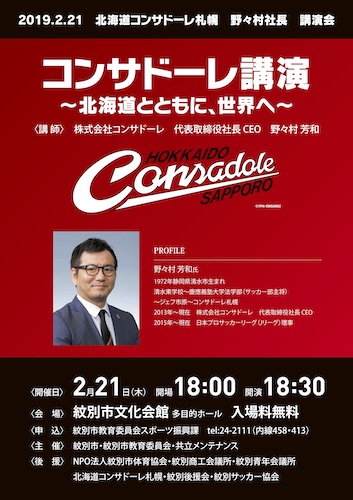 2/21に紋別市文化会館で、野々村芳和コンサドーレ社長の講演会が開かれます。