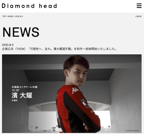 オフィシャルトップパートナーのダイアモンドヘッド株式会社のサイトで、北海道コンサドーレ札幌の濱大耀選手が登場する企業広告(TVCM)が公開されています。
