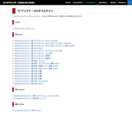 Twitter、Facebook、Instagramは、RSSを提供していないので、アンテナには登録できていません。そのかわり、タイムラインの埋め込み機能が提供されているTwitter、Facebookには、テーマ別タイムラインの一覧を用意しました。Instagramにはそういった機能は提供されていないので、いかんともしようがありませんでした。