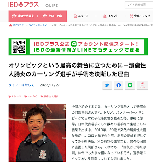 QLifeが運営するIBDプラスのサイトは、炎症性腸疾患(IBD)に関する情報を提供するサイトです。阿部晋也選手は、炎症性腸疾患(IBD)を患い手術を経てカーリング選手として活躍しており、これまでもインタビュー記事が紹介されています。