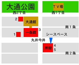 コンサグッズショップは、札幌市の中心部、大通公園のそばにあります。地下鉄『大通り駅』からすぐのところにあります。なお、シースペースが入店している丸井今井デパートは、同じエリアに、「大通館」「一条館」の2店舗を持っていますので、入る店舗をお間違えないよう。