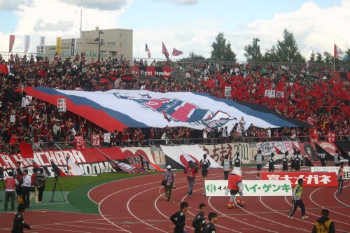 - このビッグフラッグクルー、試合ごとに十数人(ドームの場合は数十人)必要なので、以前厚別でメインに試合をしていた頃は、試合毎に募集していました。ビッグフラッグクルーに協力して参加してくれる人は、試合前にスタジアムのどこそこに集まってくださいというものです。現在は、このような形での募集はしていません。これは、セキュリティーが厳しくなったこともあるのですが、旗の運搬等で関係者エリアに入退場する必要があり、各クルーにも事前にIDカードの発行が必要ということが一つ。また、ドームなどの場合、観客席の傾斜が厚別などに比べ、かなりきついため、展開作業などに熟練が必要になったことがあげられます。クルーには、この傾斜のあるスタンドの通路をフラッグの端を持ちながら、一気に駆け上がる必要があります。なれないと危険でもあるので、このため、当日の飛び入り参加的な募集はできなくなりました。