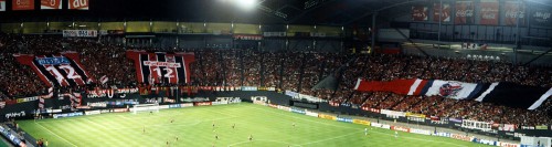 - この旗の完全な形(サイズ)でのお目見えは、98/7/29の厚別でのC大阪戦でした。現在は、ホームゲームが開催されるとき、大抵、バックスタンドで選手が入場するのに合わせて翻ります。スタンドにこのビッグフラッグが翻ったら、これがコンササポターの心意気ということを、感じとってほしいものです。