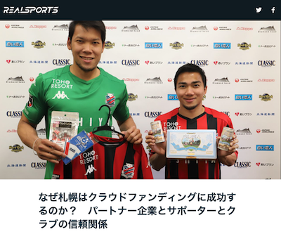 WebメディアであるREAL SPORTSのサイトで、コンサドーレが実施したクラウドファウンディングの裏側を紹介した記事が公開されています。 阿保幸菜さんによるインタビュー。 河合竜二CRCと、コンサドーレのパートナー事 … 続きを読む REAL SPORTSのサイトでコンサドーレが実施したクラウドファウンディングの裏側を紹介